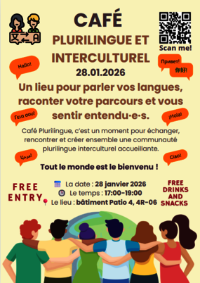 As part of my internship, I am pleased to invite you to our Multilingual and Intercultural Café, a friendly gathering where students from all faculties can practice different languages, chat freely, and meet new people. Whatever your level, you are welcome !