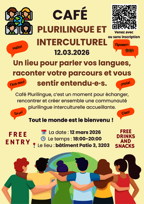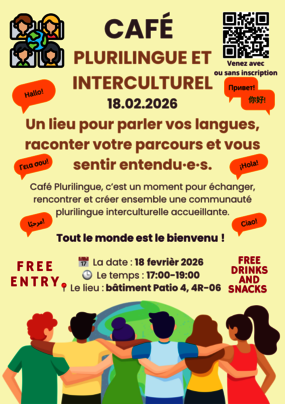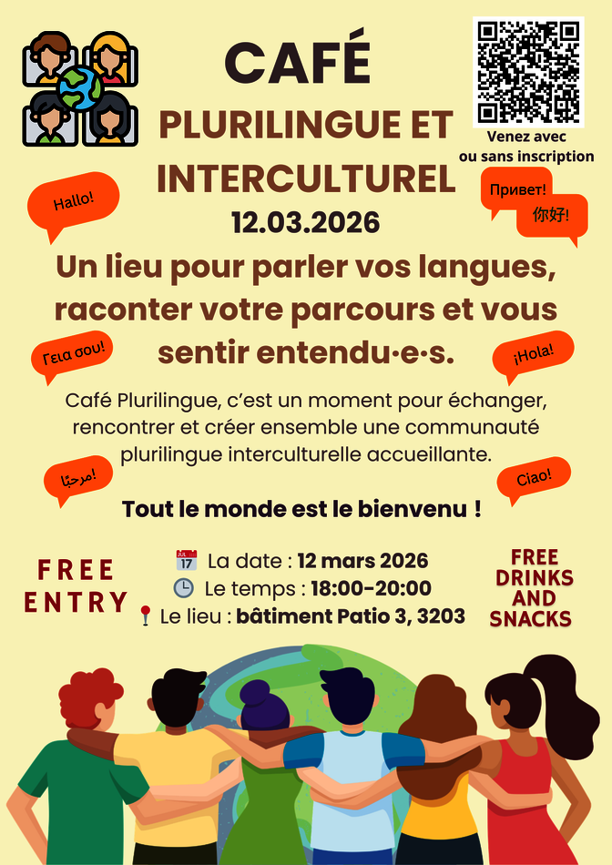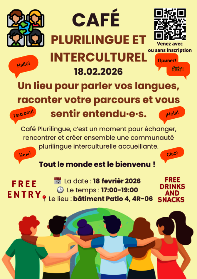 As part of my internship, I am pleased to invite you to our Multilingual and Intercultural Café, a friendly gathering where students from all faculties can practice different languages, chat freely, and meet new people. Whatever your level, you are welcome !
