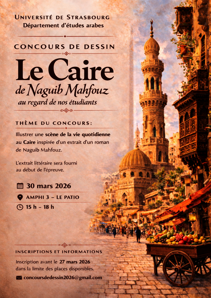 Le principe : illustrer à partir d'un texte littéraire en arabe (fourni également en traduction française) un extrait d'un roman de Naguib Mahfouz. Tout matériel de dessin accepté et technique libre. Le département fournira les feuilles et décernera 3 prix aux meilleurs dessins.