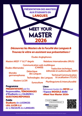Rendez-vous Mercredi 10/12 à 17 h 30 en ligne via [ https://bbb.unistra.fr/rooms/der-y6d-tke-oiz/join | BBB] pour une présentation des Masters à la Faculté des Langues & des conseils pour vos recherches de formations en vue de vos candidatures !