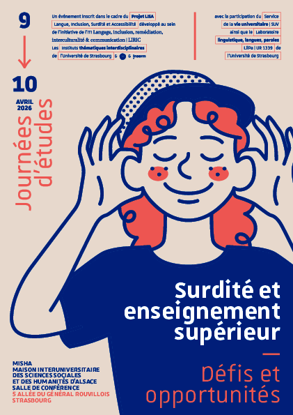 Journées d'études : "Surdité et enseignement supérieur : défis et opportunités" - Projet LISA : langage, inclusion, surdité & accessibilité - iTi-LiRiC - Université de Strasbourg 9 10 avril 2026 Salle de conférence - MISHA Programmé détaillé L’inscription, bien que gratuite, est obligatoire. Le lien d’inscription est disponible à la fin du programme.