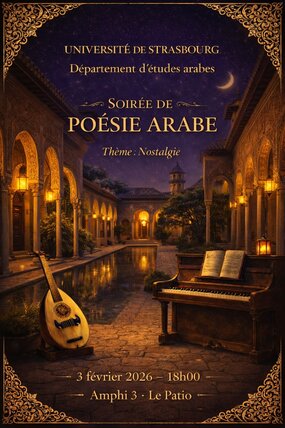 Soirée de poésie arabe Études arabes A l'invitation des étudiants du Département d'études arabes de L3 et master, une soirée littéraire et musicale sur le thème de la nostalgie 3 février 2026 18h 20h Patio Amphi 3