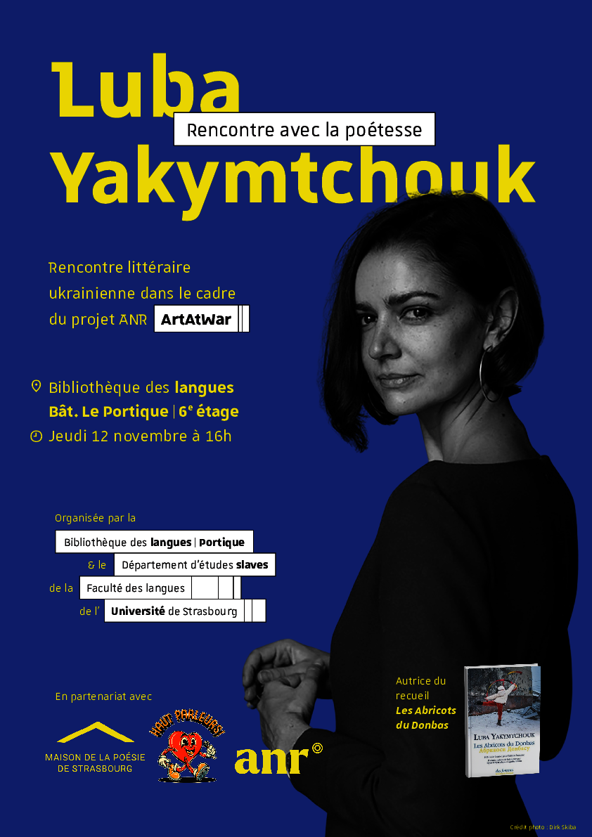 Luba Yakymtchouk, membre de l’Académie des écrivain·e·s sur les droits humains à l’Université de Strasbourg, sera de retour à Strasbourg dans le cadre du projet ANR ArtAtWar pour une rencontre littéraire le 12 novembre 2025.