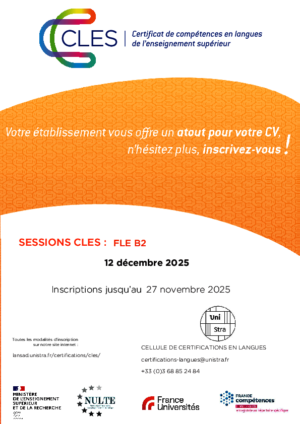 La Cellule de certifications en langues de l'Université de Strasbourg organisera un CLES de niveau B2 le 12 décembre 2025 (date limite d'inscription: 26 novembre 2025) .