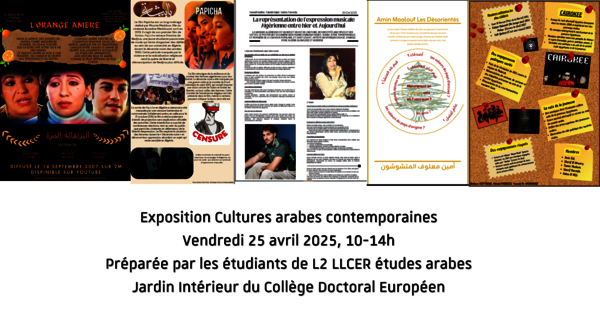 Les étudiantes et étudiants de L2 LLCER Etudes arabes mettent les cultures arabes contemporaines à l'honneur dans une exposition éphémère au Jardin intérieur du Collège doctorale européen le vendredi 25 avril 2025.